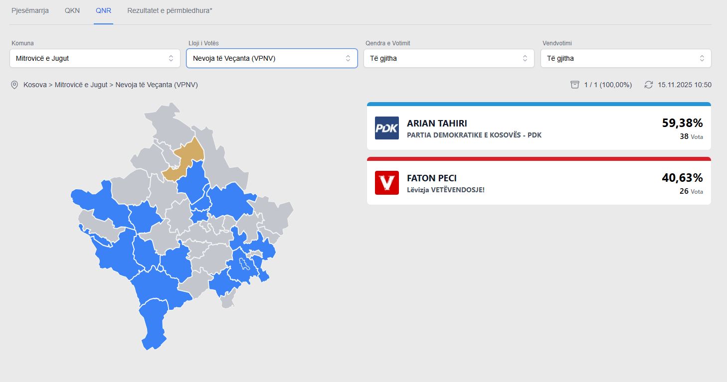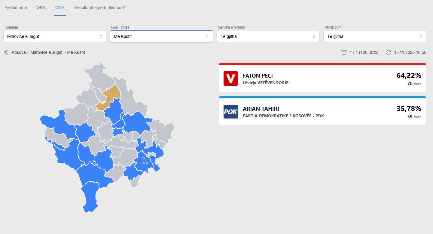 Në balotazhin e 9 nëntorit, fitues i komunës së Mitrovicës sipas rezultateve preliminare të KQZ-së, doli Faton Peci.