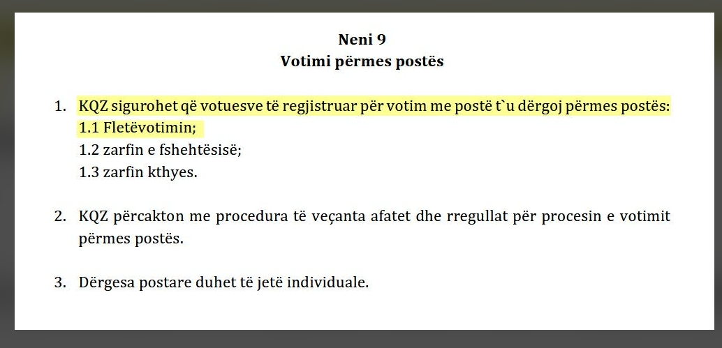 Rregullorja e KQZ-së për votim jashtë vendit e obligon KQZ-në që votuesve jashtë Kosovës të regjistruar për votim me postë t’u dërgoj përmes postës fletëvotimin, zarfin e fshehtësisë dhe zarfin kthyes.