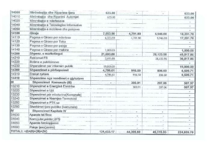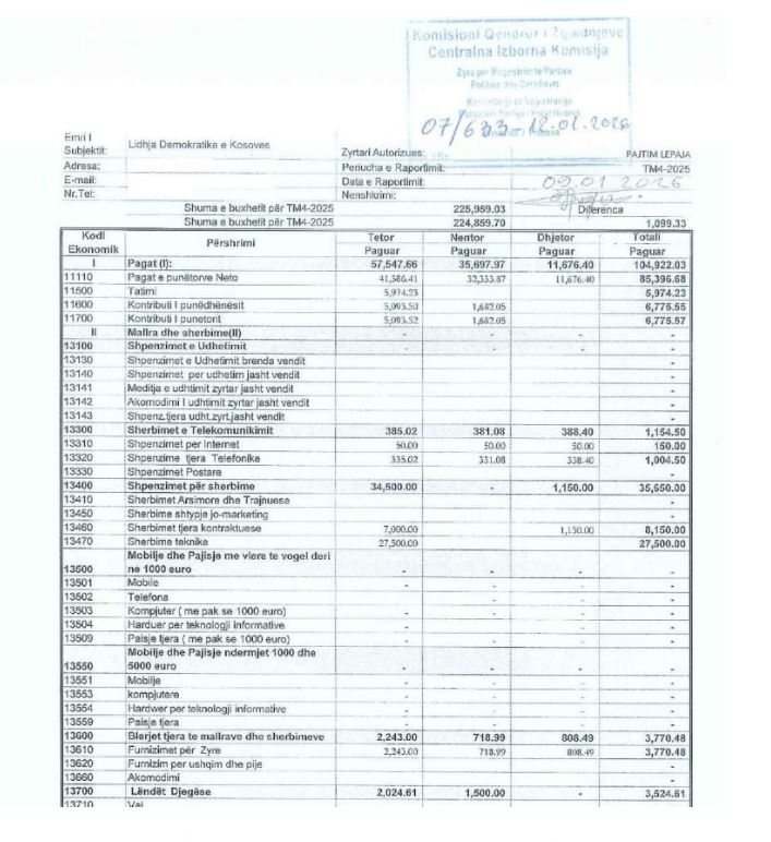 Nga kjo shumë, rreth 85 mijë euro janë shpenzuar për paga të punëtorëve. Ndërkohë, për marketing LDK-ja ka deklaruar shpenzime në vlerë prej 49 mijë e 817 eurosh.