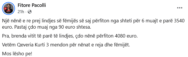 Por në fakt, jo çdo nënë do t’i merrte 4080 euro në gjashtë muajt e parë të lindjes. Pra kjo vlen vetëm te familjet që kanë 3 e më shumë fëmijë.