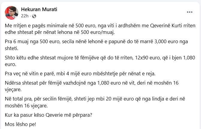 Hekuran Murati, kandidat i LVV-së për deputet dhe që në qeverinë e shkuar ishte ministër i Financave, në një shkrim në Facebook më 17 dhjetor, ka thënë se për “secilin fëmijë, shteti do t’i japë mbi 20 mijë euro që nga lindja e deri në moshën 16-vjeçare”.