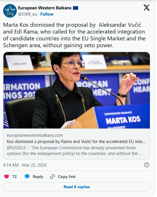 Komisionerja e BE-së për Zgjerim, Marta Kos ka hedhur poshtë propozimin e Aleksandar Vuçiqit dhe Edi Ramës, të cilët bënë thirrje për përshpejtimin e integrimit të vendeve kandidate në tregun e përbashkët të BE-së dhe në hapësirën Shengen, pa marrë të drejtën e vetos, shkruan gazeta serbe Nova.rs.