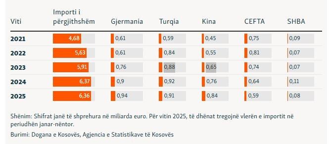 Kjo shumë tashmë ka tejkaluar vlerën e importeve nga vendet anëtare të CEFTA-s – Shqipëria, Serbia, Maqedonia e Veriut, Mali i Zi, Bosnje dhe Hercegovina dhe Moldavia – të cilat tradicionalisht kanë qenë ndër partnerët kryesorë tregtarë të Kosovës në rajon.