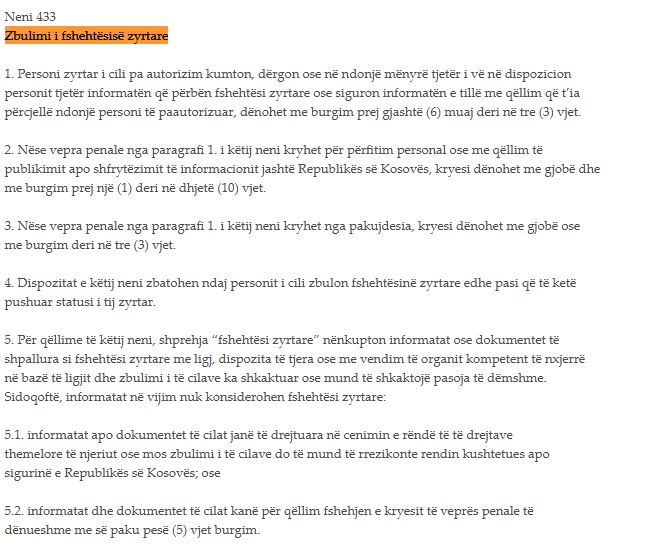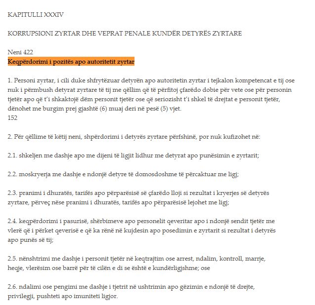 Sipas Kodit Penal të Kosovës, kur një person zyrtar akuzohet për veprën penale “keqpërdorim i pozitës apo autoritetit zyrtar”, mund të dënohet me burgim prej gjashtë muaj deri në pesë vjet.