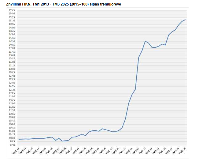 Sipas Agjencisë së Statistikave të Kosovës, indeksi i tërësishëm i Kostos së Ndërtimit në Kosovë (IKN) pati rritje për 0.5 për qind në TM3 2025, krahasuar me TM2 2025. Ndërkaq, krahasuar TM3 2025 me të njëjtën periudhë të vitit paraprak (TM3 2024), Indeksi i Kostos së Ndërtimit pati rritje për 3.6 për qind.