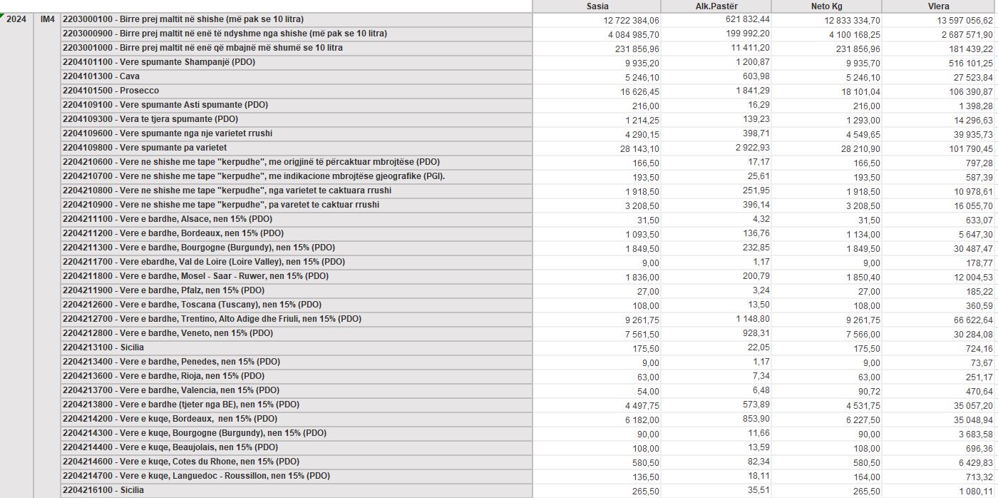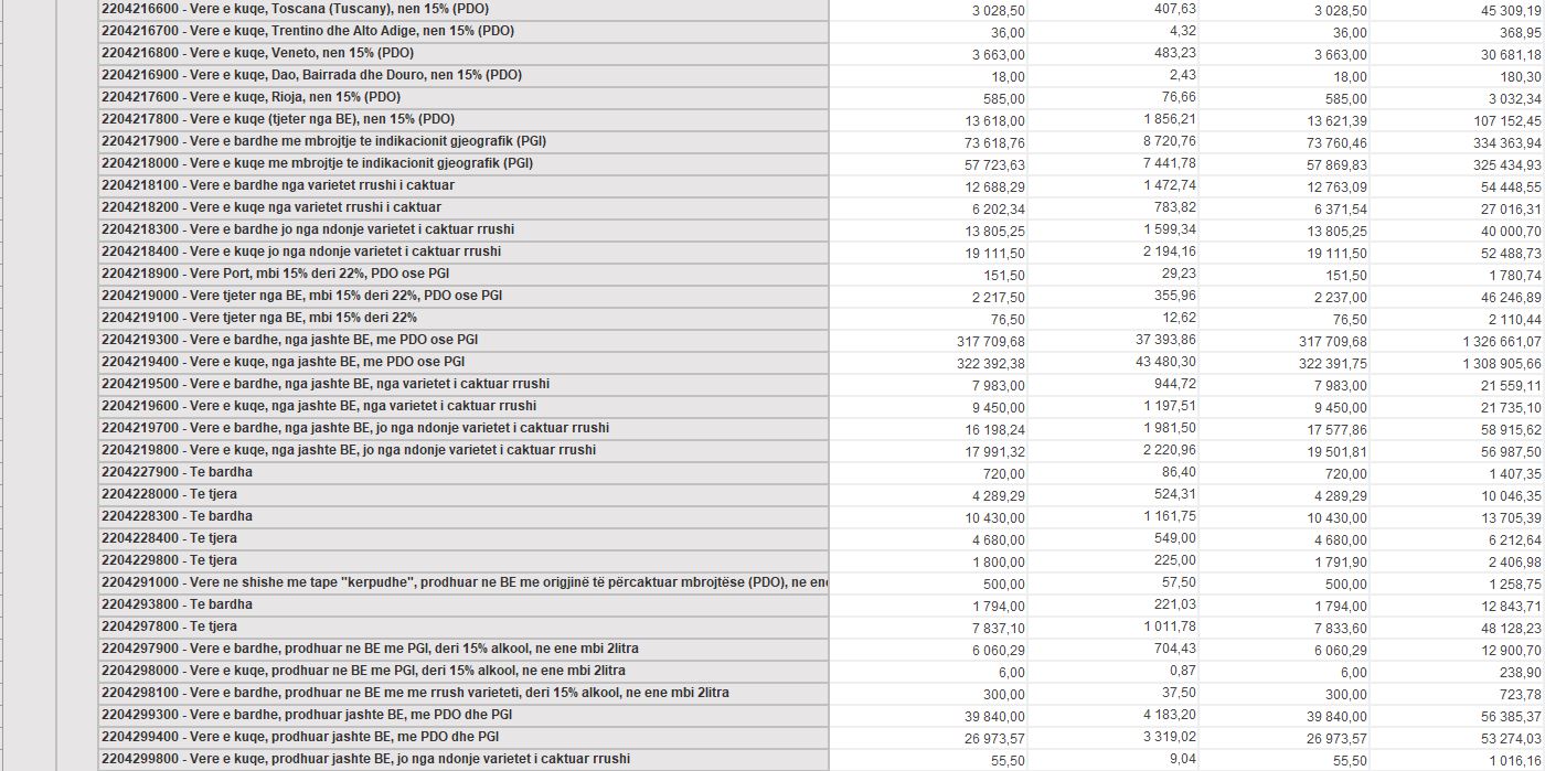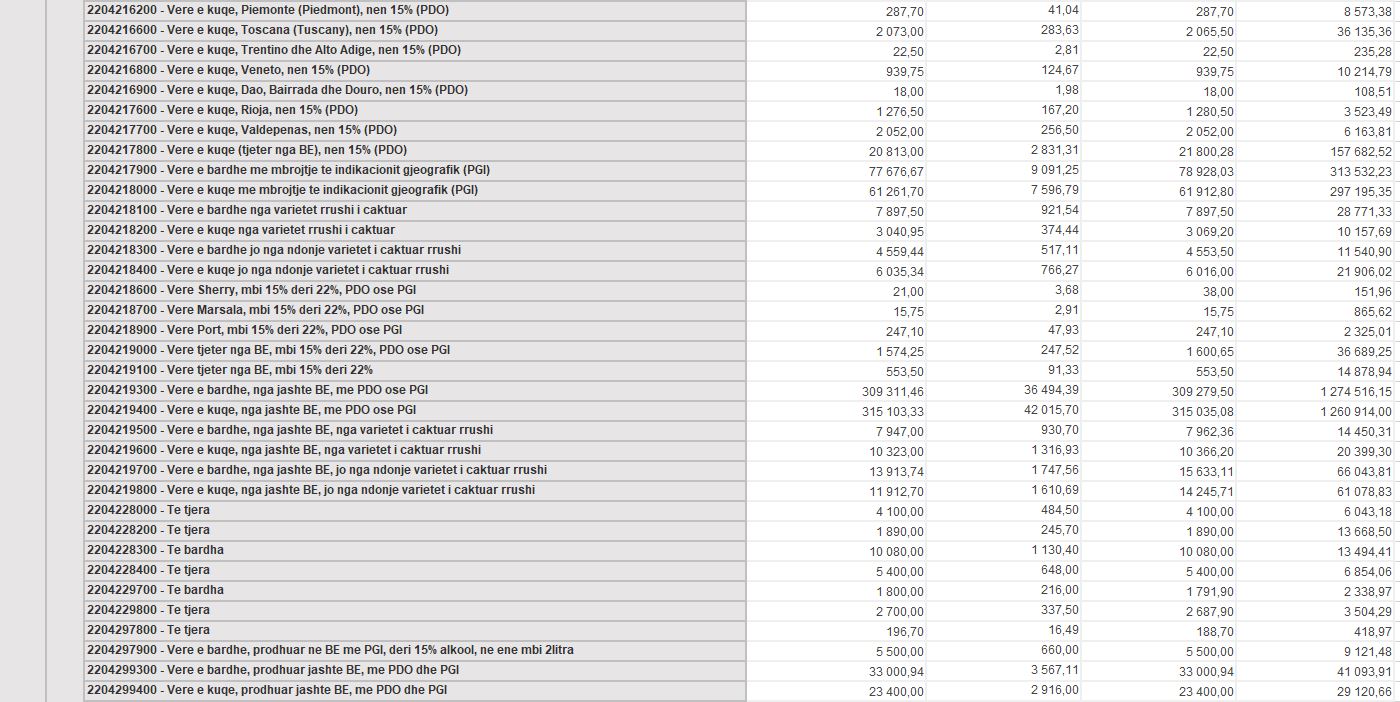 Ndryshe nga birra dhe pijet e forta, verërat kanë shënuar rënie në vitin 2025. Në vitin 2024, importi i verërave kishte vlerë doganore mbi 5 milionë euro, ndërsa në vitin 2025 kjo shifër ka rënë në rreth 4.4 milionë euro.