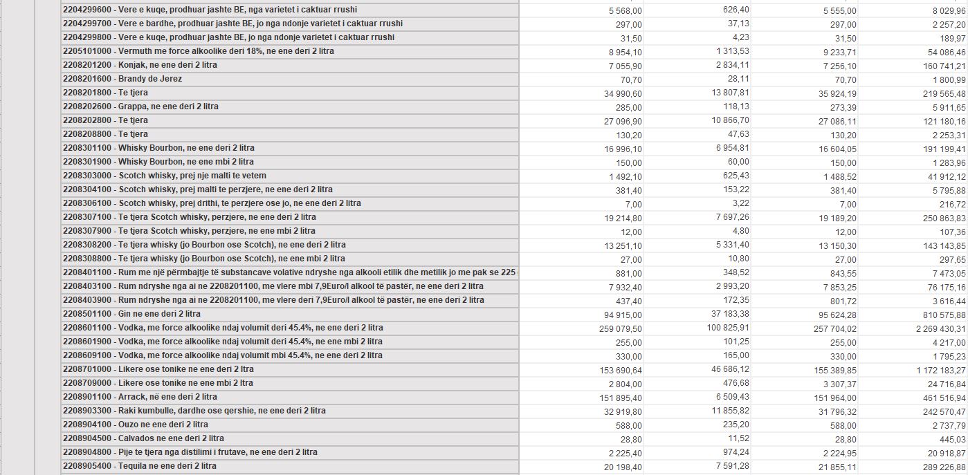 Rritje të dukshme gjatë vitit 2025 kanë shënuar edhe pijet alkoolike të forta, përfshirë uiskin, vodkën, rumin dhe pijet e tjera me përmbajtje të lartë alkooli. Në vitin 2024, importi i kësaj kategorie kishte vlerë rreth 8.9 milionë euro, ndërsa në vitin 2025 kjo vlerë ka kaluar 9.5 milionë euro.