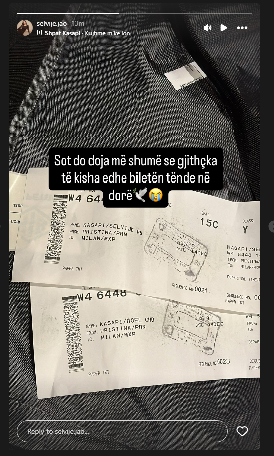 Ajo ka publikuar biletat e tyre, duke i shoqëruar me fjalët: “Sot do doja më shumë se gjithçka të kisha edhe biletën tënde në dorë”, përcjell Indeksonline.