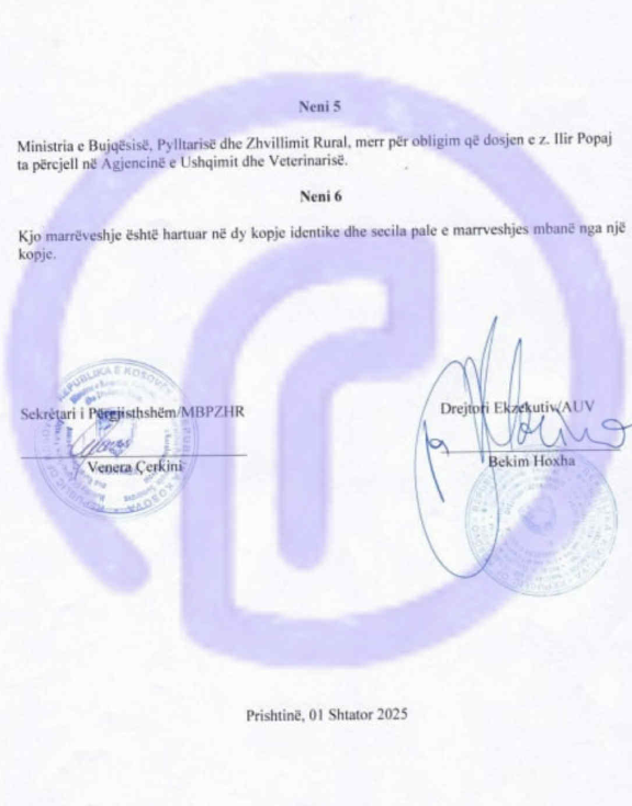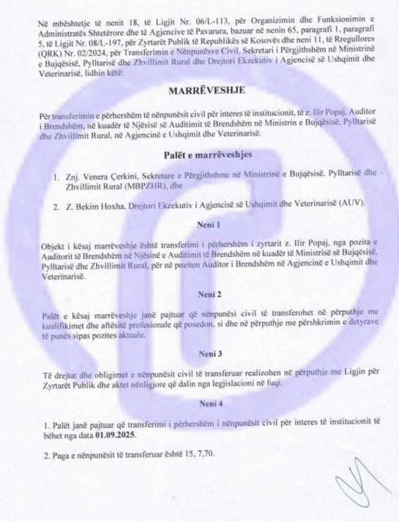 “Objekt i kësaj marrëveshjeje është transferimi i përhershëm i zyrtarit z. Ilir Popaj, nga pozita e Auditorit të Brendshëm në Ministrinë e Bujqësisë në pozitën e Auditorit të Brendshëm në Agjencinë e Ushqimit dhe Veterinarisë”, thuhet në dokumentin e siguruar nga Periskopi.
