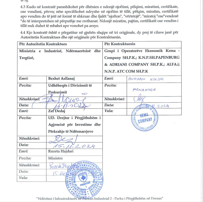 Megjithatë, pavarësisht këtij vendimi administrativ dhe detyrues, Ministria nuk e ka anuluar procedurën. Përkundrazi, ajo ka vazhduar me finalizimin e kontratës. Dokumentet kontraktuale tregojnë se kontrata është nënshkruar më 15 nëntor 2024, nga përfaqësuesit e autoritetit kontraktues, përfshirë edhe ministren Rozeta Hajdari, e cila ka vendosur nënshkrimin e saj në emër të Ministrisë së Industrisë, Ndërmarrësisë dhe Tregtisë.