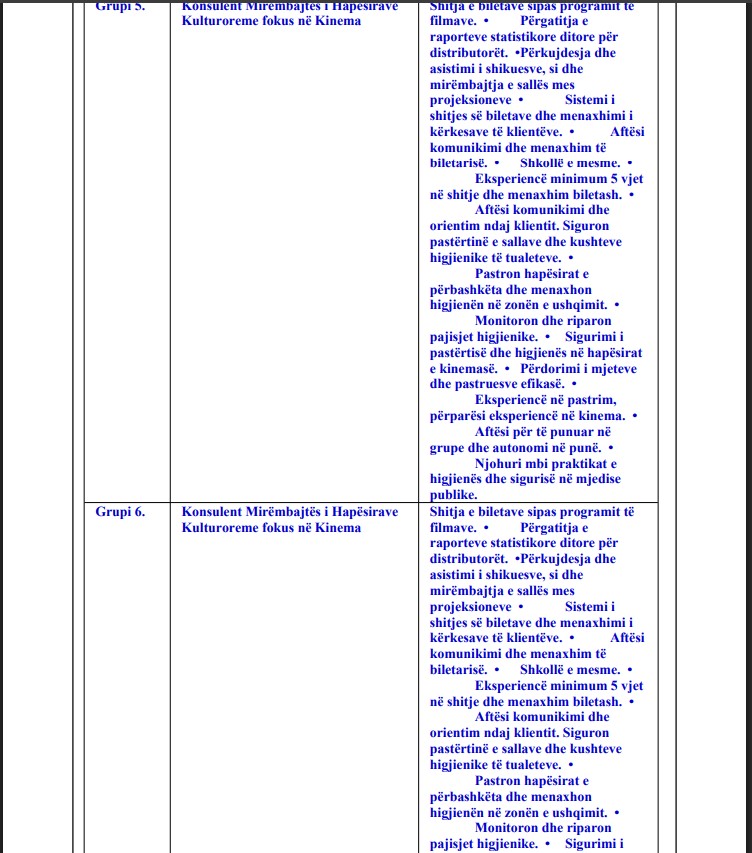Në dosjen e tenderit, MKRS ka paraparë 10 grupe pozicionesh “konsulentësh” që variojnë nga Konsulent i Marketingut dhe PR, te Konsulent Kino Operator e deri te Konsulent Mirëmbajtës i Hapësirave Kulturore, me detyra që shkojnë nga menaxhimi i faqeve të internetit e mediave sociale, administrimi i emailave të Google Workspace, shitja e biletave, përkujdesja për publikun e deri te pastrimi i ambienteve të kinemave.