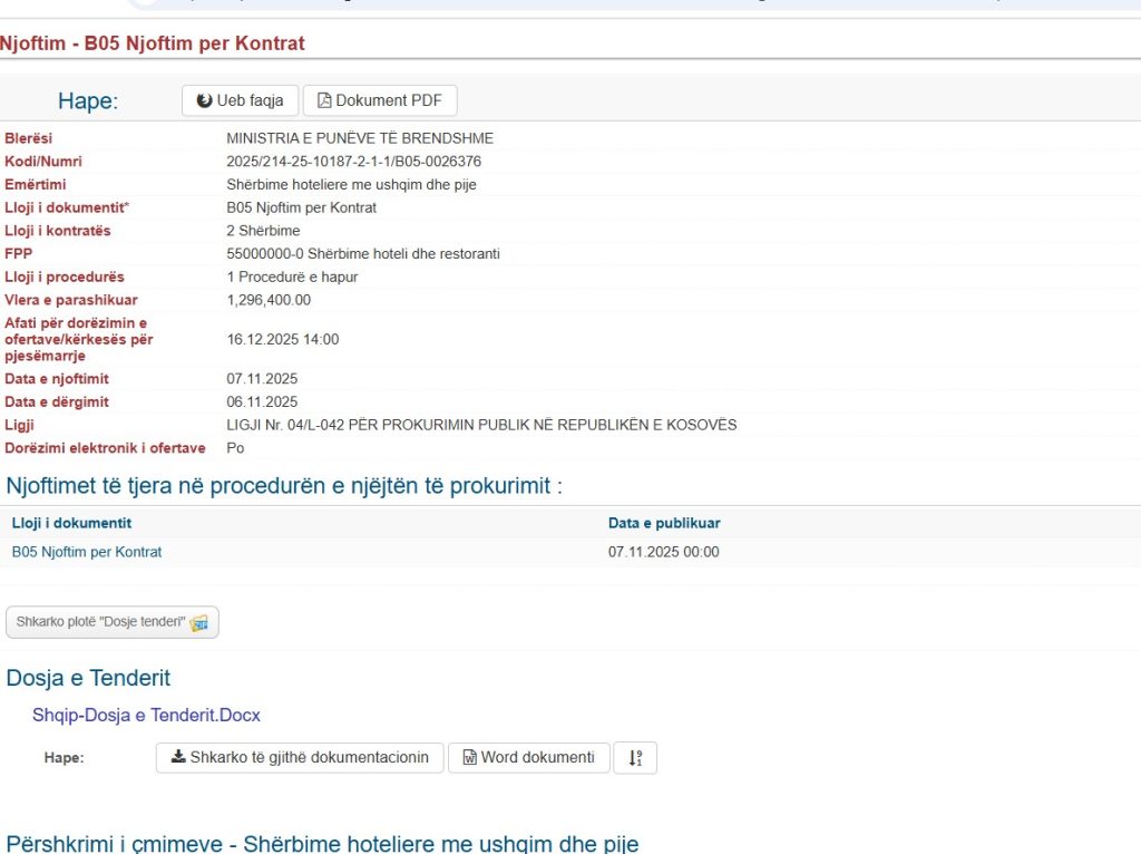 Afati i fundit për dorëzimin e ofertave është 16 dhjetor 2025, ndërsa hapja publike e tyre do të bëhet po atë ditë, në ora 14:00, në zyrat e MPB-së në Prishtinë.