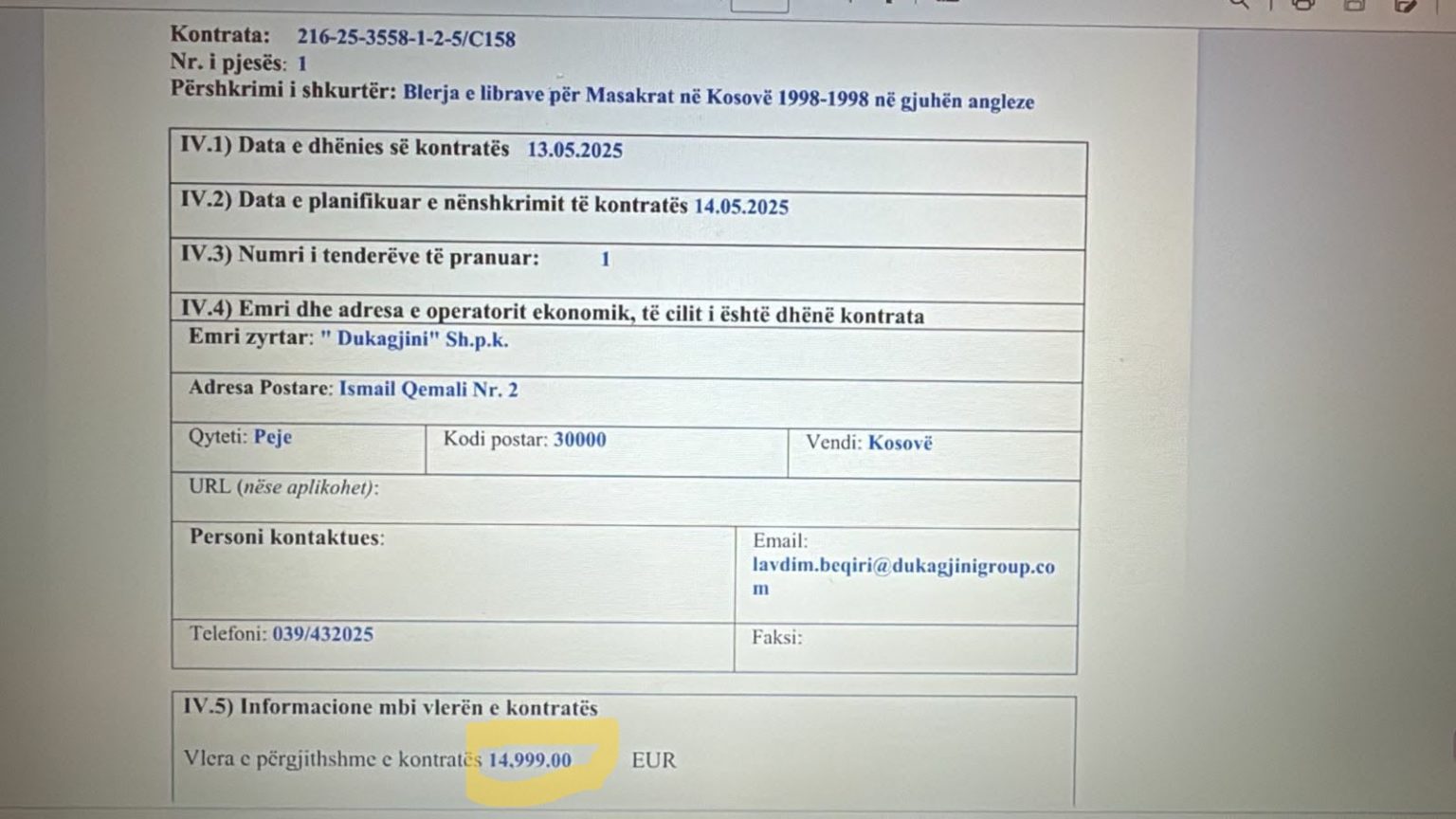 Kontratën të cilën e ka siguruar “Betimi për Drejtësi” në mes të Ministrisë së Punëve të Jashtme dhe “Dukagjinit” ka vlerën e 14 mijë e 999 eurove.