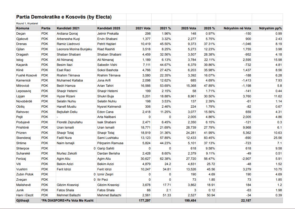 PDK ka tregu performancë të mirë dhe është fituesja më e madhe në raundin e parë me rritje të numrit të votave për kryetarë nga 177,297/2021 në 199,484/2025 apo një ndryshim pozitiv prej +22,187 votave në roundin e parë (pa diasporë dhe vota me kusht).