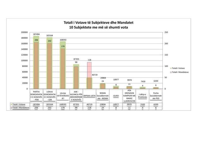 Aleanca për Ardhmërinë e Kosovës (AAK) ka marrë 87,355 vota dhe 99 mandate, ndërsa Lista Serbe që përfaqëson komunitetin serb me 40,719 vota dhe 118 mandate.
