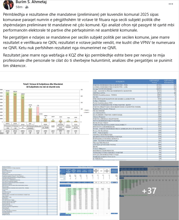 “Kjo analizë ofron një pasqyrë të qartë mbi performancën elektorale të partive dhe përfaqësimin në asambletë komunale”, ka shkruar Ahmetaj.