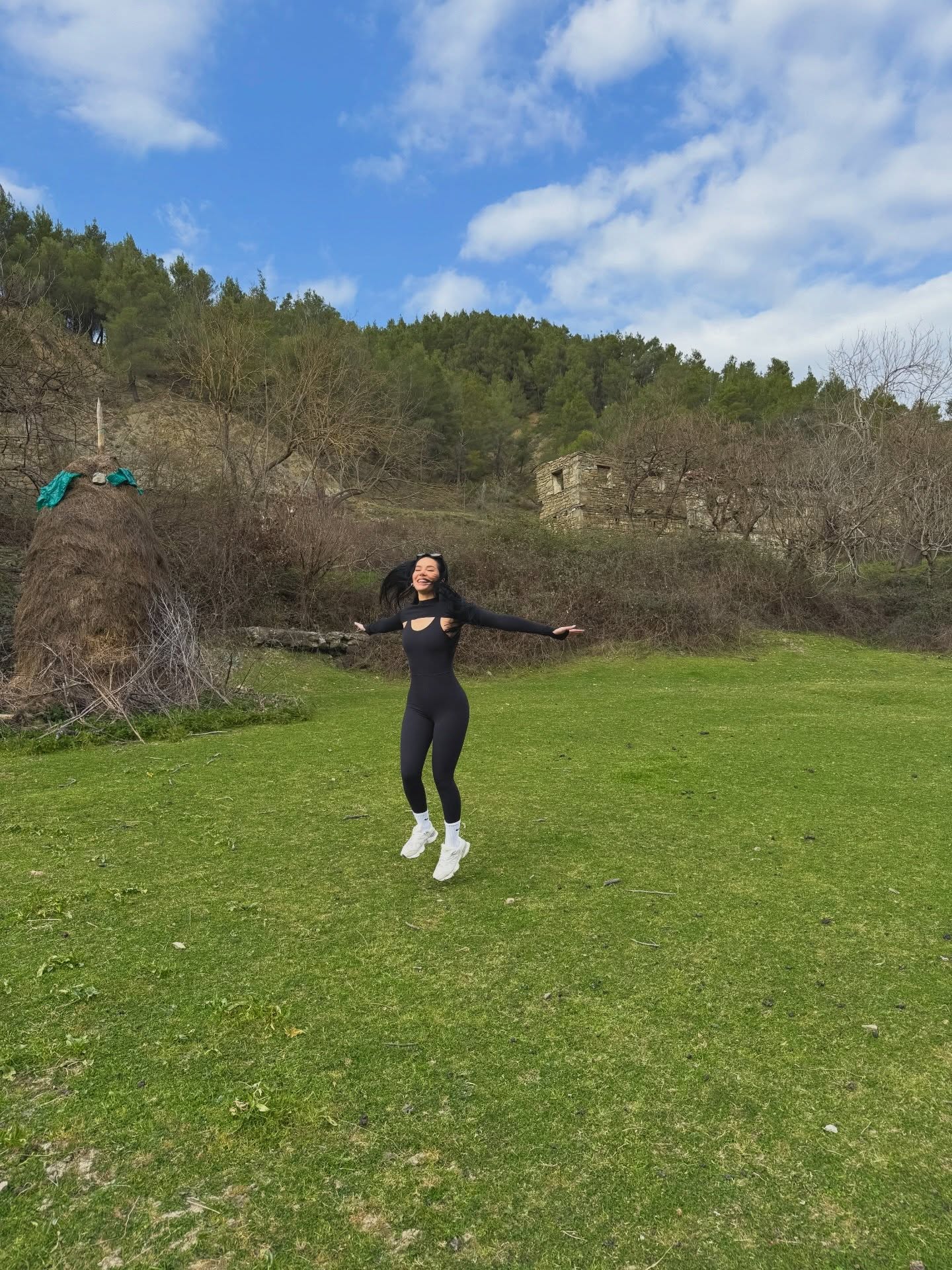 Ajo duket mjaft e lumtur dhe e relaksuar mes gjelbërimit, duke shijuar momentet e thjeshta që i ofron ky ambient.