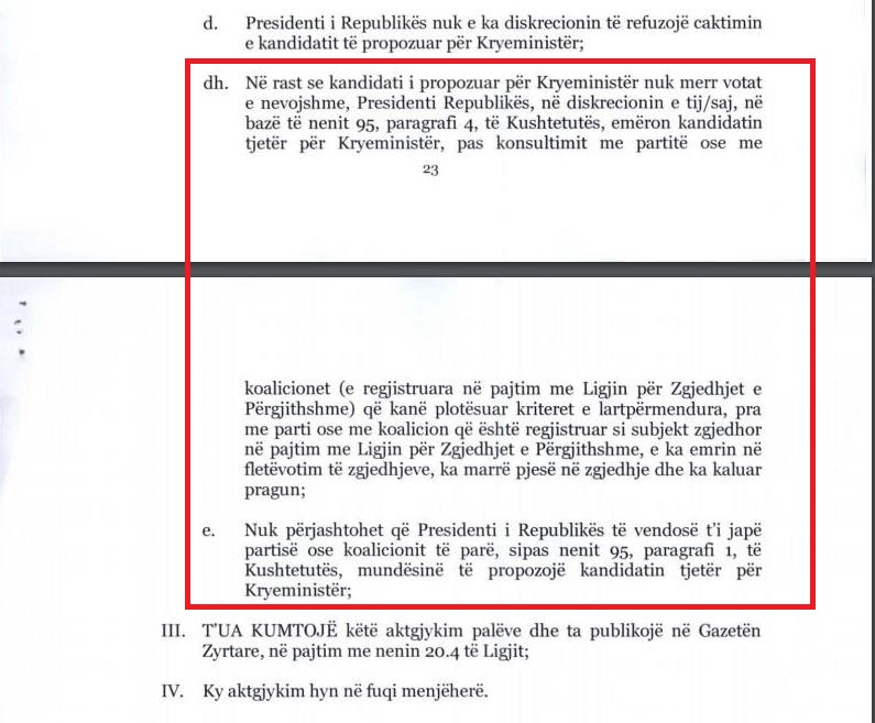 Megjithatë, në pikën (e) të këtij vendimi thuhet shumë qartë që Presidenti mund të vendosë t’ia japë mundësinë kujtdo dhe theksin aty e vendos tek partitë e tjera, ndërkaqnë rol dytësor epërmend edhe që Presidenti mund të vendosë që t’ia japë mundësinë sërish partisë ose koalicionit të parë.