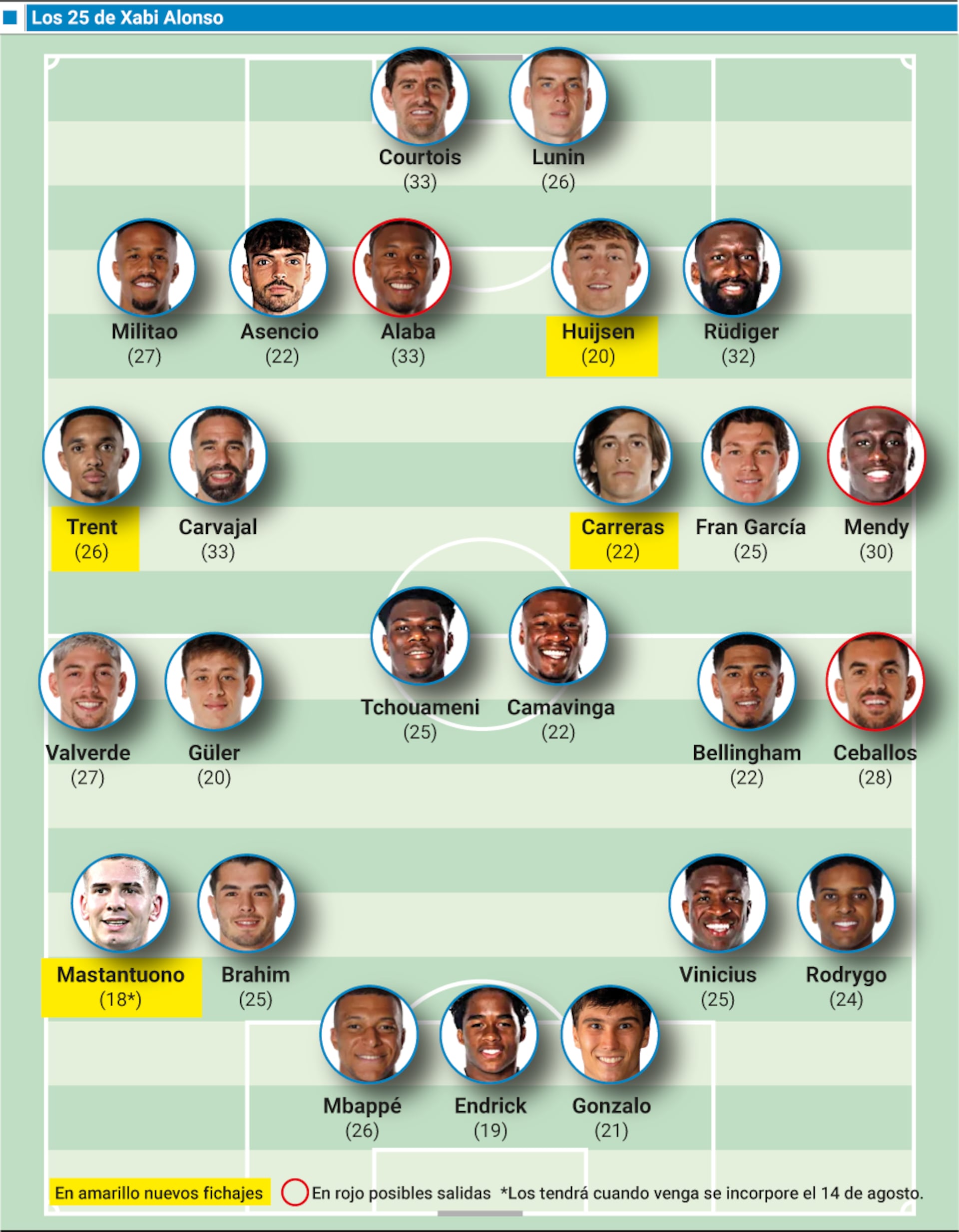 Vetëm pesë lojtarë janë 30 vjeç ose më shumë: Courtois, Alaba, Rüdiger, Carvajal dhe Mendy. Në të kundërt, nëntë lojtarë janë 22 vjeç ose më pak: Gonzalo, Endrick, Mastantuono, Bellingham, Camavinga, Güler, Carreras, Huijsen dhe Asencio. Një ekip me të ardhme, pa dyshim, ku sulmi është pjesa më e re, me lojtarë si Mastantuono, Brahim, Mbappé, Gonzalo, Endrick, Vinicius dhe Rodrygo, që kanë moshë mesatare 22.5 vjeç.