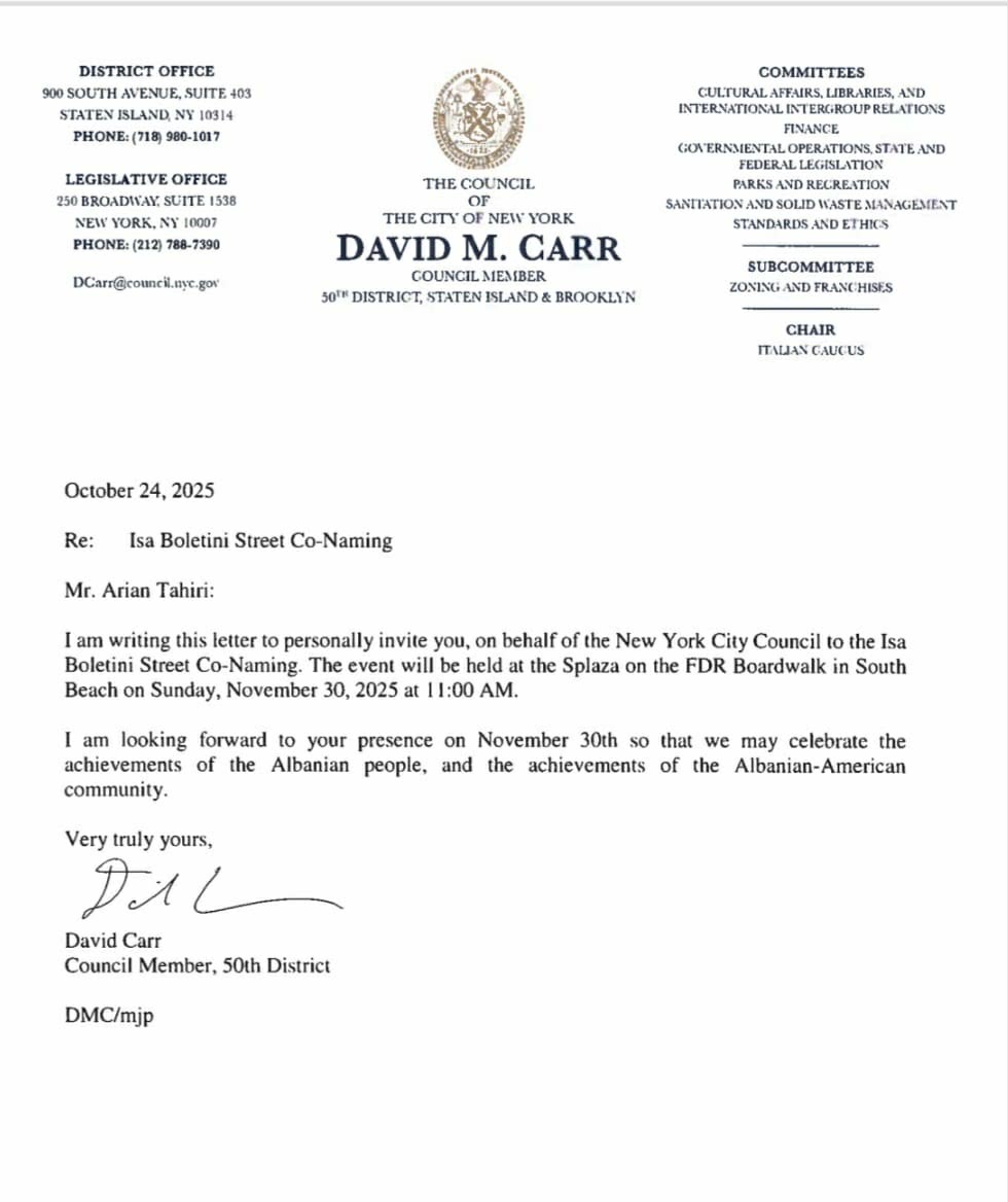 Po ju shkruaj këtë letër për t’ju ftuar personalisht, në emër të Këshillit të Qytetit të Nju-Jorkut, në ceremoninë e bashkë-emërtimit të Rrugës “Isa Boletini”. Ngjarja do të mbahet në sheshin pranë shëtitores FDR, në South Beach, të dielën, më 30 nëntor 2025, në ora 11:00. Pres me padurim pjesëmarrjen tuaj më 30 nëntor që të festojmë së bashku arritjet e popullit shqiptar dhe të komunitetit shqiptaro-amerikan.