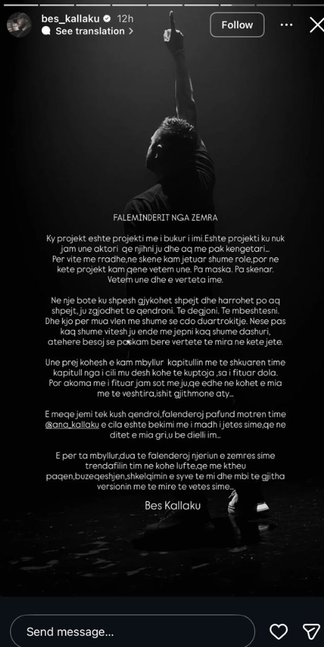 Në këtë mesazh, aktori nuk ka lënë pa përmendur mbështetjen e tij më të madhe, motrën Ana Kallaku, duke e quajtur bekimin më të madh dhe “diellin në ditët e tij gri”.
