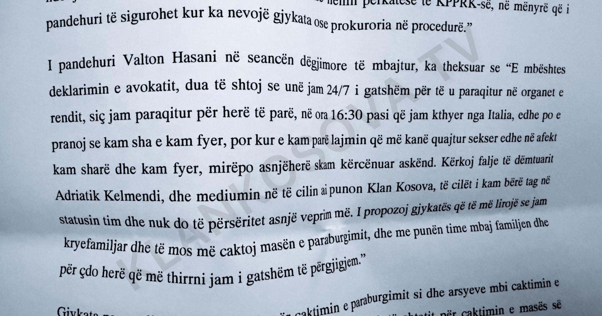 “I pandehuri Valton Hasani në seancën dëgjimore të mbajtur, ka theksuar se “E mbështes deklarimin e avokatit, dua të shtoj se jam 24/7 i gatshëm për të u paraqitur në organet e rendit siç jam paraqitur për herë të parë në ora 16:30 pasi që jam kthyer nga Italia dhe po e pranoj sa kam sha e kam fyer, por kur e kam parë lajmin që më kanë quajtur sekser edhe në afekt kam sharë e kam fyer, mirëpo asnjëherë s’kam kërcënuar askënd. Kërkoj falje të dëmtuarit Adriatik Kelmendit dhe mediumin në të cilin ai punon, Klan Kosova, të cilët i kam bërë tag në statusin tim dhe nuk do të përsëritet asnjë veprim më. I propozoj gjykatës që të më lirojë se jam kryefamiljar dhe të mos më caktojë masën e paraburgimit dhe më punën time mbaj familjen dhe çdo herë që më thirrni jam i gatshëm të përgjigjem”, thuhet në vendimin e Gjykatës Themelore mbi çështjen e caktimit të masës së sigurisë.