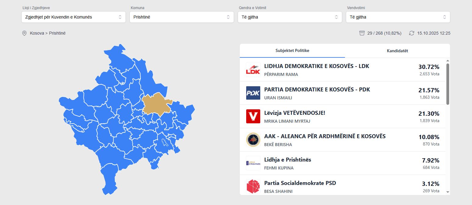 Pas përditësimit të mbi 10% të vendvotimeve të procesura për Kuvendin Komunal në Prishtinë, LDK vazhdon të jetë e para.