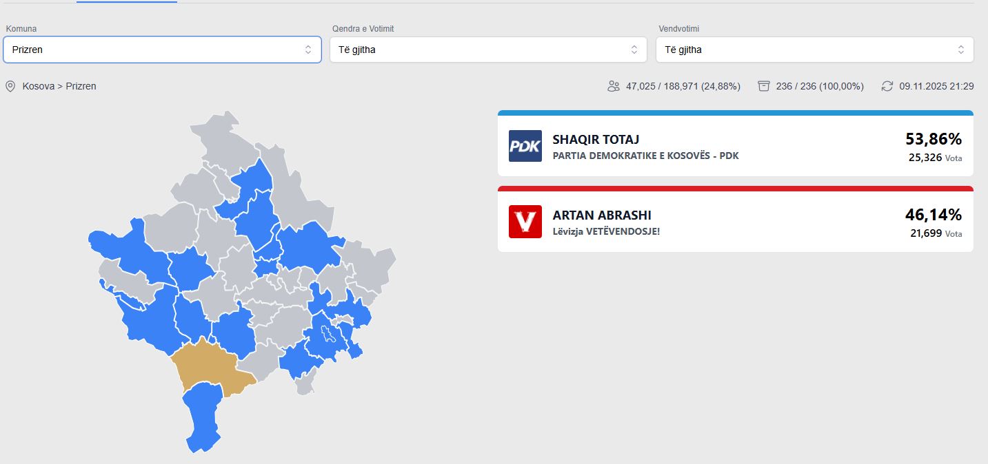 KQZ ka numëruar 100% të votave, ku Totaj del fitues i balotazhit mes tij dhe Artan Abrashit të VV-së, transmeton Klankosova.tv.