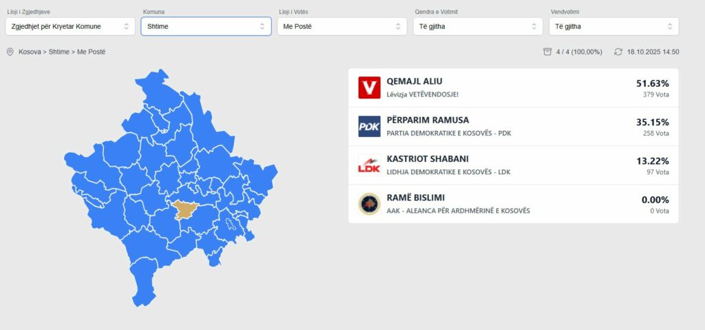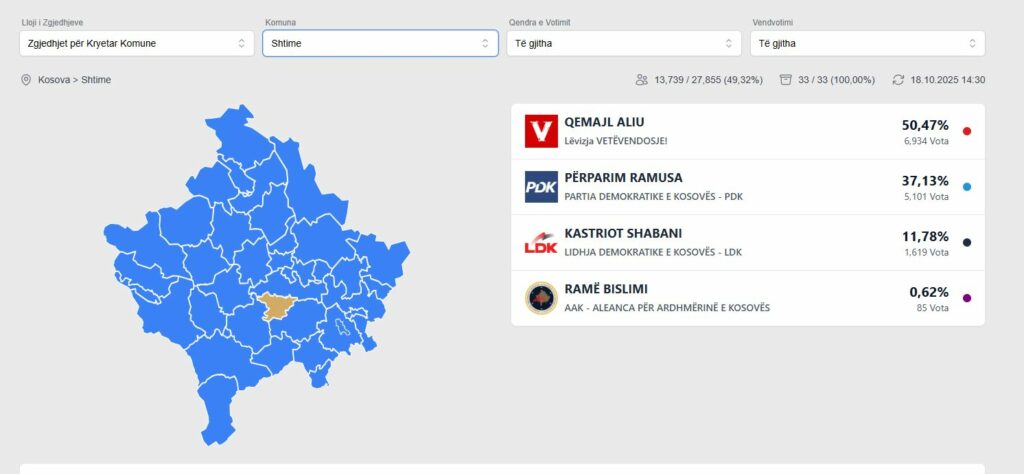 Nga ky numërim, sipas të dhënave të publikuara nga KQZ, kryetari aktual i Shtimes, Qemajl Aliu prin me 51.63% të votave, e cili pasohet nga Përparim Ramusa i PDK-së, i cili ka grumbulluar plot 35.15% të votave, transmeton Klankosova.tv.