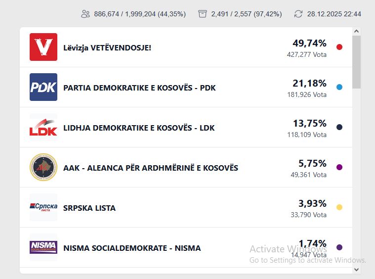 Lëvizja Vetëvendosje po fiton me 49.74 për qind të votave.
