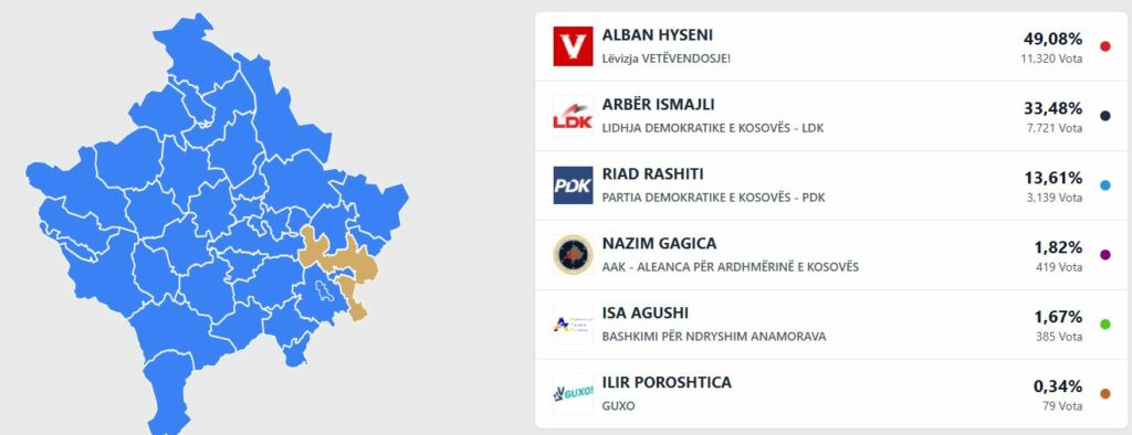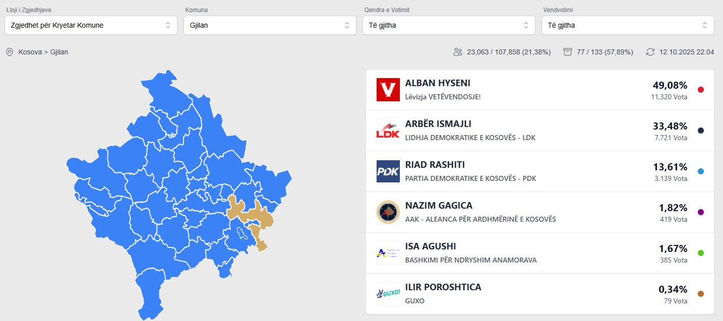 Në komunën e Gjilanit janë numëruar mbi 50 për qind të kutive të votimit, ku i pari është Alban Hyseni nga VV me mbi 11 mijë vota.