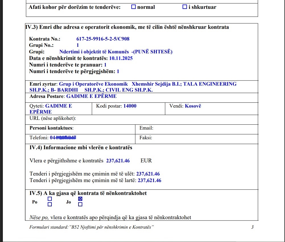 Kontrata është lidhur me të njëjtin grup operatorësh ekonomikë: Xhemshir Sejdija B.I., TALA ENGINEERING SH.P.K., B-BARDHI SH.P.K. dhe CIVIL ENG SH.P.K. përmes procedurës së negocimit pa publikim të njoftimit për kontratë, një praktikë që përdoret zakonisht për punë të paparapara gjatë zbatimit të projekteve.