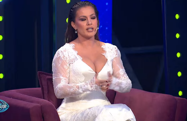 Ajo me një fustan të bardh me material saten të kombinuar me dantel, duket si një nuse në vitet e 90-ta.