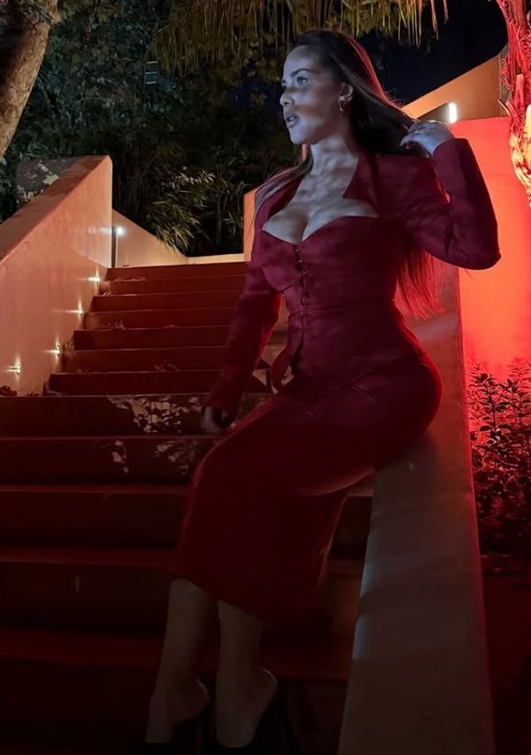 E veshur me një kostum ngjyrë të kuqe të thellë, me prerje elegante dhe detaje të guximshme, ajo shfaqi një kombinim të përsosur mes finesës dhe sensualitetit.