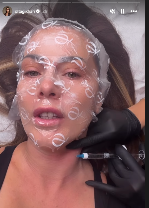 Në imazh, Olta duket e qetë teksa një profesionist kryen një ndërhyrje minimale në zonën e fytyrës, duke lënë të kuptohet se bëhet fjalë për një procedurë estetike, trajtim kundër rrudhave, shkruan Indeksonline.