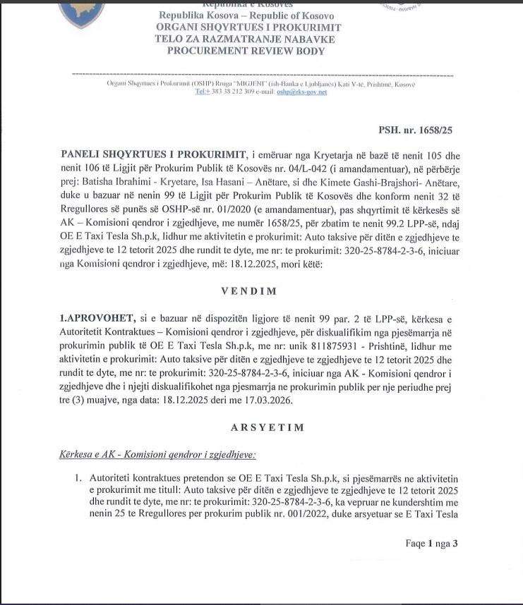 Vendimi është marrë më 18 dhjetor 2025, në bazë të nenit 99 paragrafi 2 të Ligjit për Prokurim Publik, dhe lidhet me aktivitetin e prokurimit të iniciuar nga KQZ për sigurimin e auto-taksive në ditën e zgjedhjeve të 12 tetorit 2025 dhe rundin e dytë.
