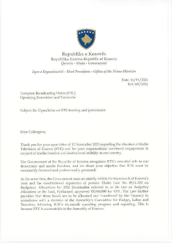 “Për kontekst, kur u krijua një ngërç i ngjashëm më herët këtë vit, Qeveria mundësoi funksionimin e RTK-së përmes një mase përkohshme dhe të jashtëzakonshme të huasë, një episod që ju gjithashtu e përmendët në letrën tuaj duke vazhduar të inkurajonte zgjidhje institucionale”.