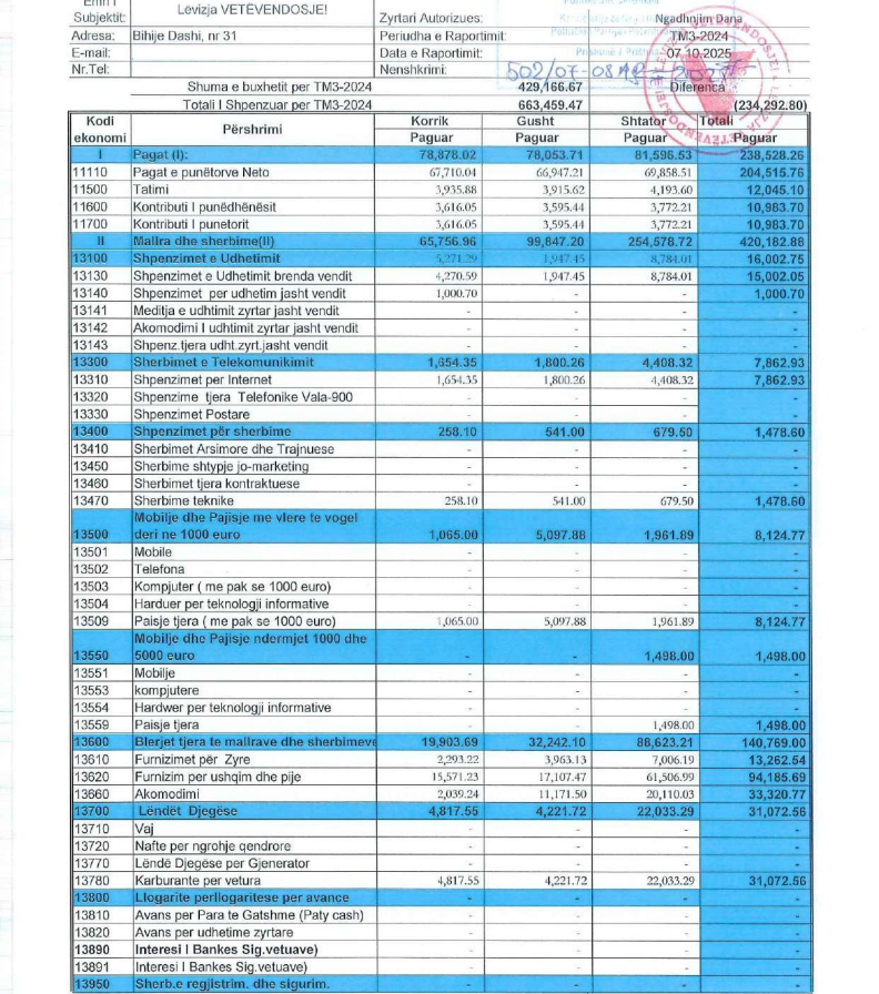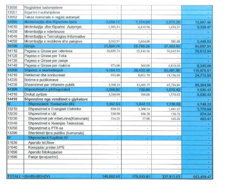 Shuma më e madhe e tyre, nga VV është dedikuar për mallra dhe shërbime, që për tre muaj kap shumën e mi 420 mijë eurove, ndërkaq vetëm për paga janë shpenzuar për tre muaj plot 238 mijë e 528 euro.