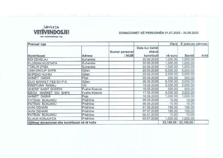 Gjatë këtyre tre muajve, VV ka pranuar 23 mijë e 160 euro. 1000 euro i ka dhuruar donacion Glauk Konjufca, Avni Dehari 330 euro ndërsa të tjerat nga persona jashtë partisë dhe që nuk kanë pozita në parti. /Lajmi.net/