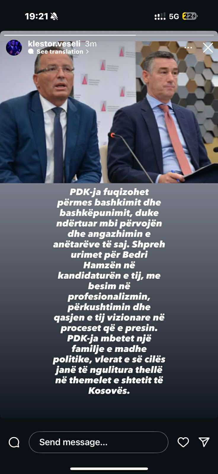 Përmes një postimi në llogarinë e tij në Instagram, Klestor Veseli, ka shkruar se PDK-ja fuqizohet përmes bashkimit dhe bashkëpunimit, duke ndërtuar mbi përvojën dhe angazhimin e anëtarëve të saj.