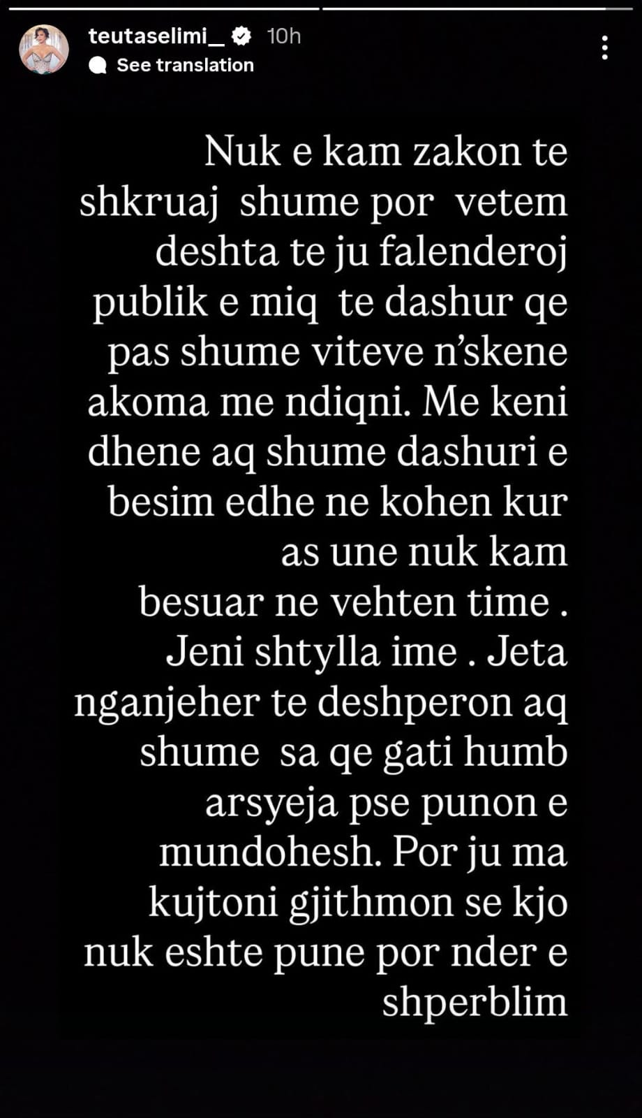 Përmes një postimi në InstaStory, këngëtarja ka falënderuar publikun që e ka mbështetur pa kushte, duke zbuluar se kjo mbështetje ka qenë jetike për të në momentet më të vështira.