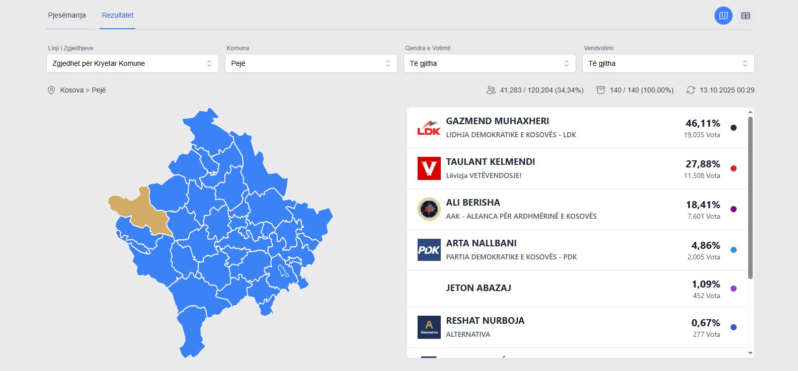 Atje, i pari në listë ka dalë Gazmend Muhaxheri me 46,11% të votave, ndërsa pas tij, i dyti është Taulant Kelmendi i Lëvizjes Vetëvendosje me 27,88% të votave.