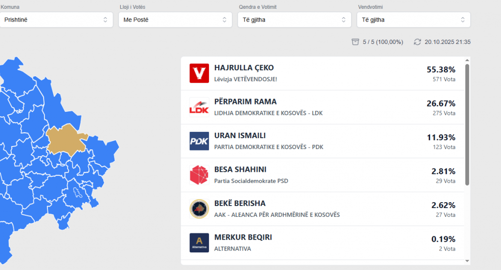 Në zgjedhjet lokale të 12 tetorit, Përparim Rama prin në Prishtinë me 33.79 për qind të votave, kurse pas tij renditet Hajrulla Çeku me 33.01 për qind të votave.