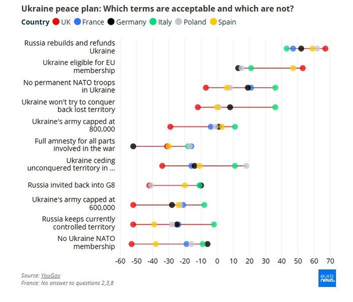 Të anketuarit në Mbretërinë e Bashkuar, Gjermani, Francë, Spanjë, Itali dhe Poloni bien dakord se termi më pak i pranueshëm i një marrëveshjeje të mundshme paqeje do t’i mundësonte Rusisë të mbante të gjitha territoret ukrainase që mban aktualisht – që përbëjnë afërsisht një të pestën e Ukrainës.