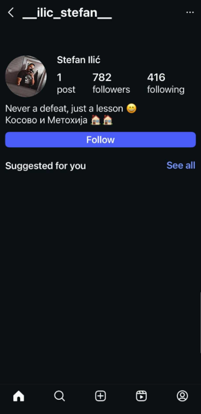 Stefan Iliç, zyrtar policor që i përket gjeneratës së 62-të të Policisë së Kosovës, prej kohësh në profilin e tij në Instagram mban mbishkrimin “Kosova e Metohija”, një referencë jozyrtare dhe politike që nxit përçarje dhe urrejtje, e cila, sipas ligjeve në fuqi, përbën vepër të dënueshme.