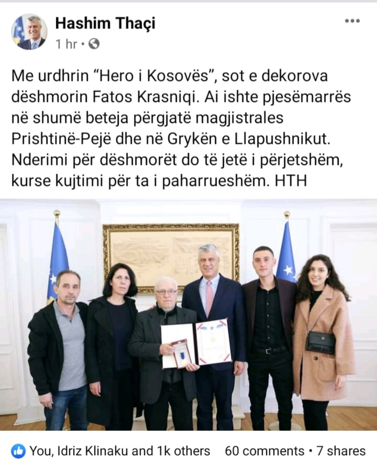 Me urdhrin “Hero i Kosovës”, sot e dekorova dëshmorin Fatos Krasniqi. Ai ishte pjesëmarrës në shumë beteja përgjatë magjistrales Prishtinë-Pejë dhe në Grykën e Llapushnikut. Nderimi për dëshmorët do të jetë i përjetshëm, kurse kujtimi për ta i paharrueshëm. HTH/Fokusi.info