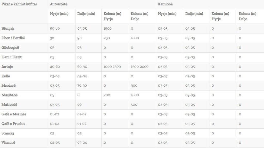 Në përditësimin e fundit nga Qendra Kombëtare për Menaxhimin Kufitar, tregon se pritjet për të dalë nga Kosova shkojnë deri në një orë e gjysmë në disa pika kufitare, e në disa të tjera pritjet nuk shkojnë mbi 5 minuta.