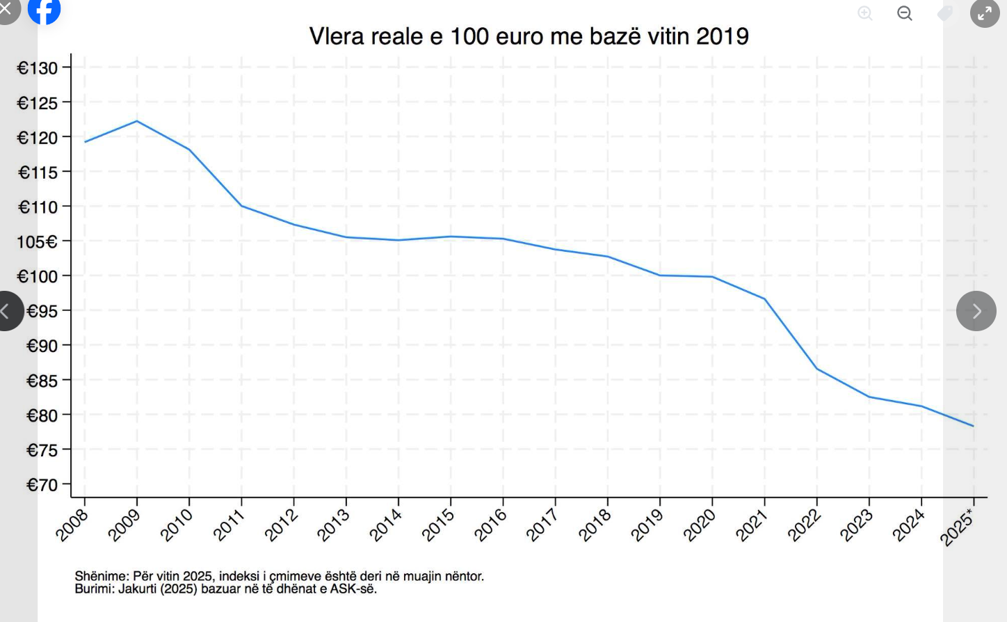 “Në letër, paratë nuk ndryshojnë. 100 euro janë gjithmonë 100 euro. Kjo quhet vlerë nominale. Por ajo që ndryshon është sa mund të blesh me to. Kur çmimet rriten, me të njëjtat para blen më pak – kjo është vlera reale e parasë,” shpjegoi në postimin e tij në Facebook ndër të tjera Jakurti.