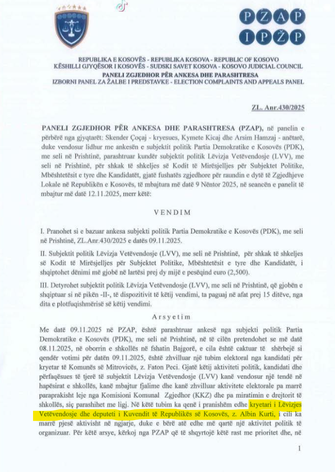 PZAP e quan Albin Kurtin “deputet të Kuvendit” në gjobën ndaj VV-së, 2 mijë e 500 euro për shkelje të heshtjes zgjedhore
