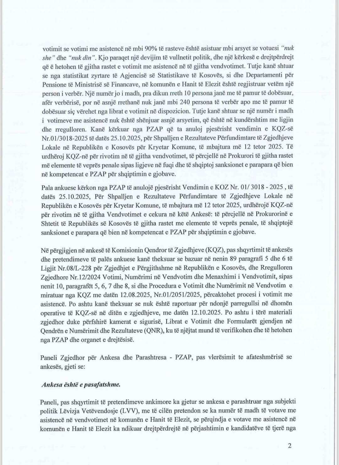 Paneli Zgjedhor Për Ankesa dhe Parashtresa, ka refuzuar ankesën e Lëvizjes Vetëvendosje në këtë institucion, si të pasafatshme. Në arsyetim thuhet se ankesa nuk është valide. Ndryshe, VV u ankua për këtë Komunë, anipse s’kishte kandidatë të vetin. Aty fitues mbetet kadidati i PDK-së, Mehmet Ballzai.